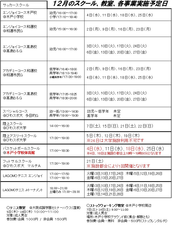 【スケジュール】12月の日程を更新しました