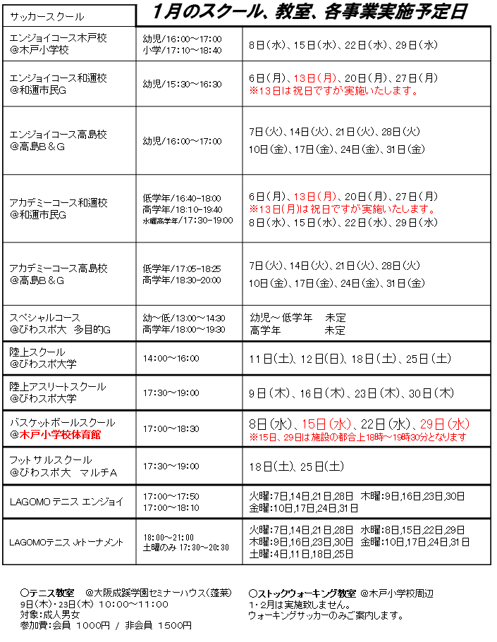 【スケジュール】1月の日程を更新しました