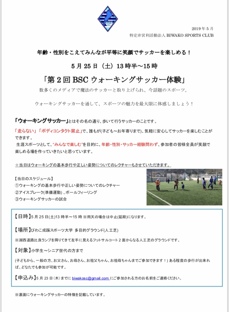 【募集】BSCウォーキングサッカー体験(5/25)参加者募集のお知らせ
