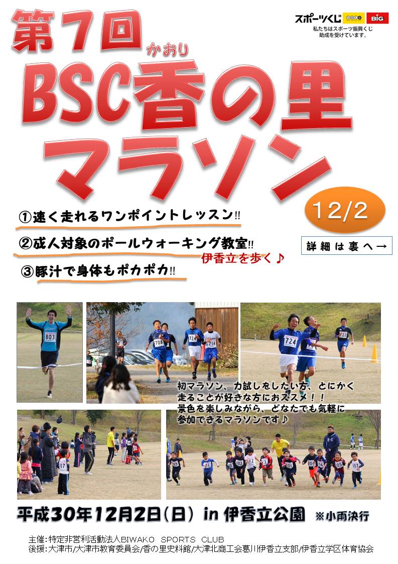 【募集】第7回BSC・香の里マラソン(12月2日)参加者募集のご案内 2018年11月12日 biwako-sc イベント 12月2日(日)毎年恒例のBSC香の里マラソンを開催いたします! 初マラソン、力試しをされたい方、走ることが好きな方にオススメです♪ 《参加申込み》 〇申込方法 下記必要事項を明記の上、メールにてお申し込みください。 ①氏名(ふりがな) ②学年(参加区分) ③性別 ④小学校名(小学生のみ) ⑤緊急連絡先 申込先⇒biwakosc@gmail.com 〇申し込み締め切り 2018年11月23日(金) 〇お問い合わせ先 BSC事務局 担当:久保(090-3865-0722) 共有:TwitterFacebook