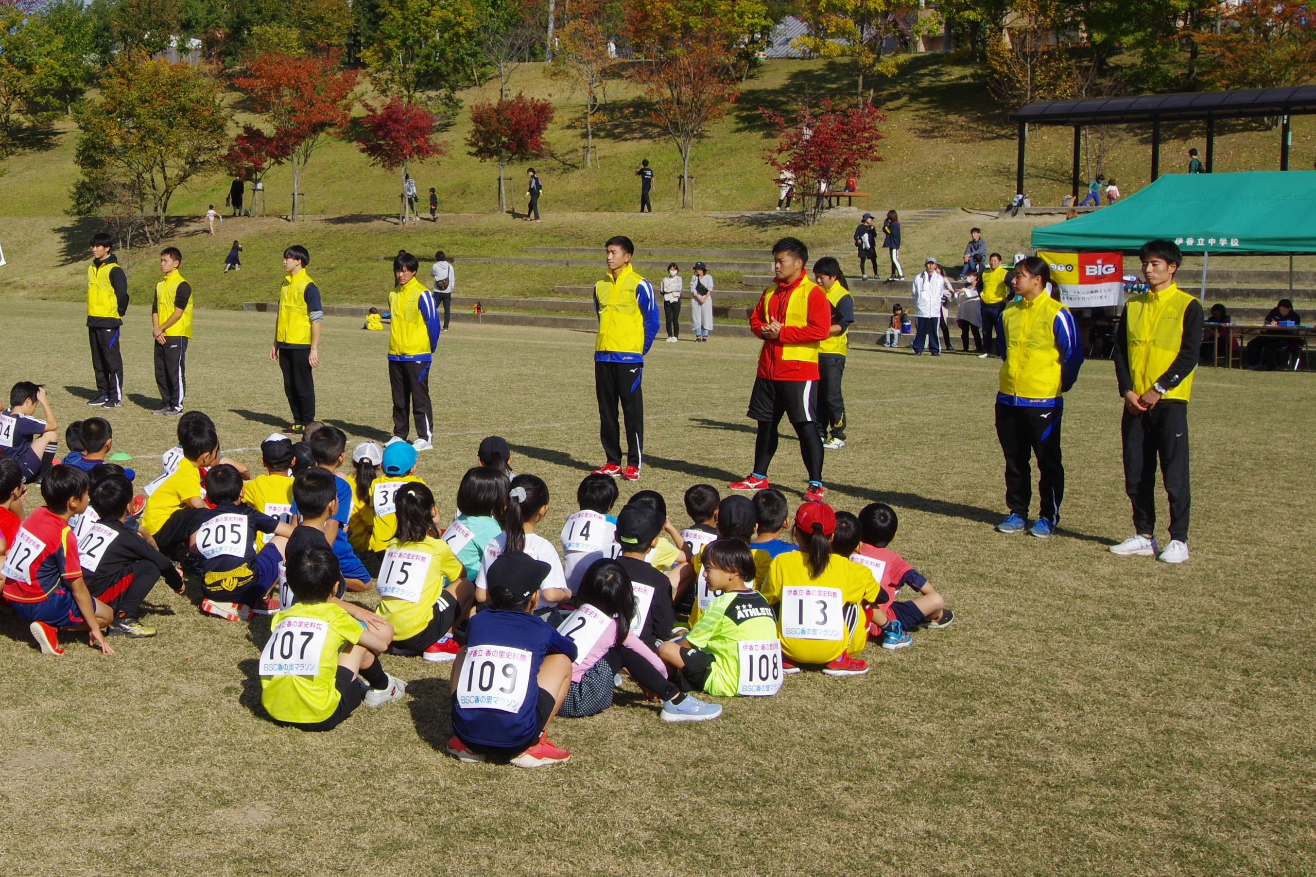 毎年恒例スタート前にはびわこ成蹊スポーツ大学陸上部の学生によるウォーミングアップを兼ねたワンポイントレッスンを実施。