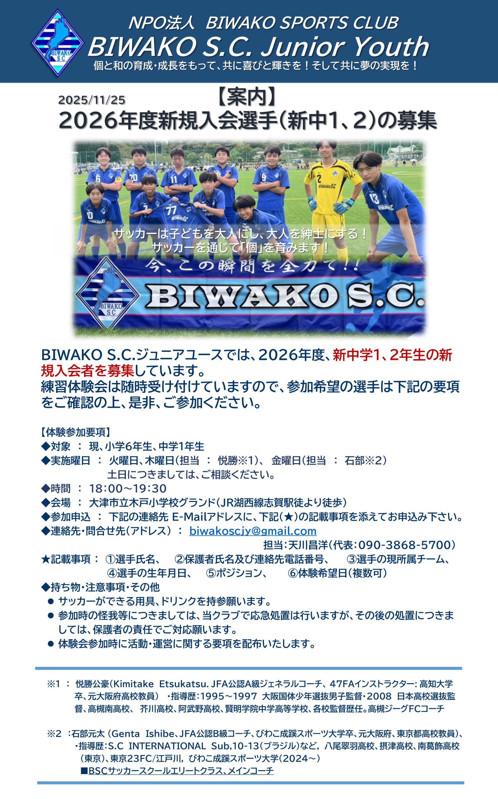 この度、BIWAKO S.C.ジュニアユースでは2026年度の新中学1・2年生の募集をいたします。