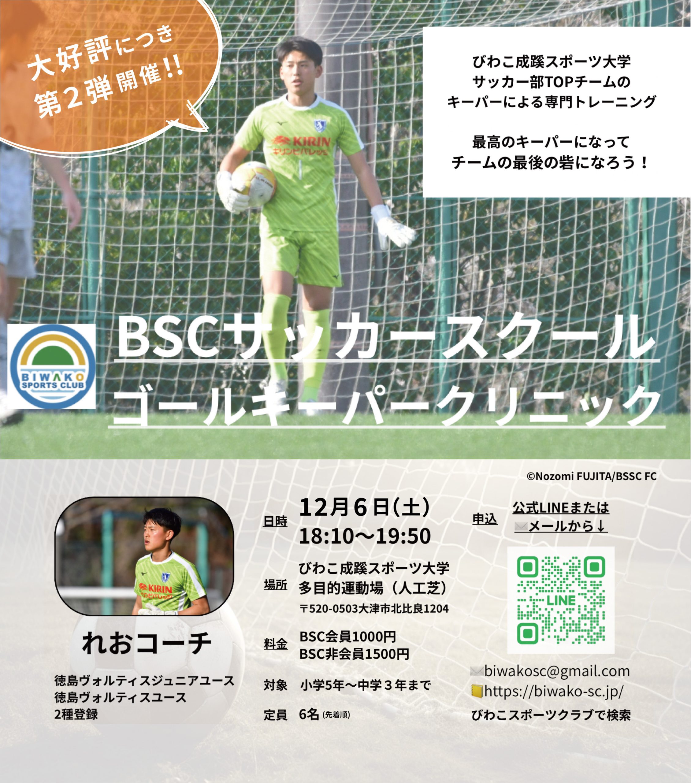 前回ご好評いただいたBSCゴールキーパークリニック、第2弾を12月6日(土)に開催いたします⚽️前回ご都合あわなかった方も是非!人工芝の恵まれた環境で、びわこ成蹊スポーツ大学サッカー部トップチームキーパーの れおコーチに、少人数トレーニングでキーパースキルやテクニックを学びましょう!
