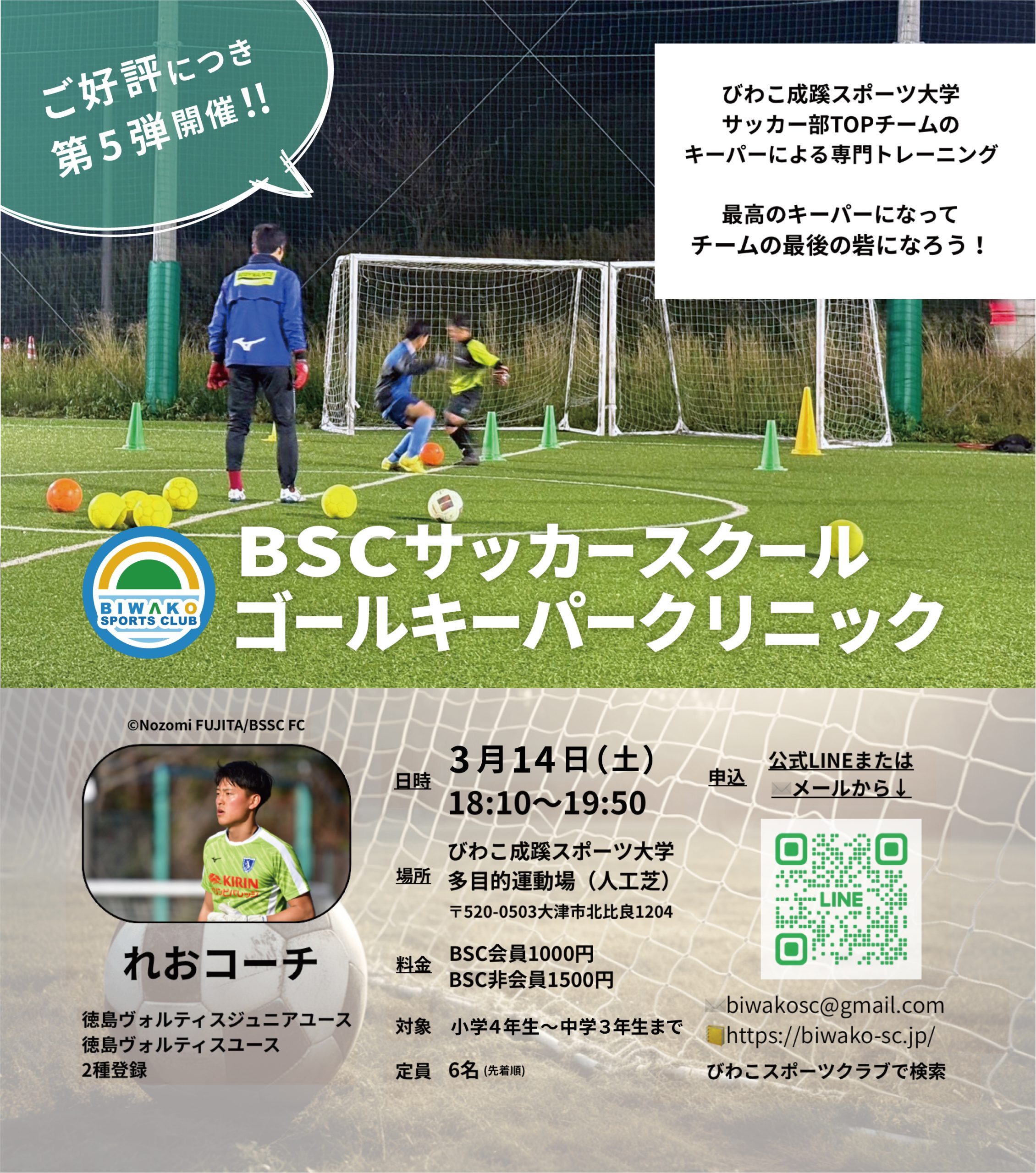 これまで4回開催し、ご好評いただいているBSCゴールキーパークリニック!第5弾を3月14日(土)に開催いたします⚽️来年度、新小学5年生になる方も対象になりました!特殊スキルを身につけたい方も、是非♪ 人工芝の恵まれた環境で、びわこ成蹊スポーツ大学サッカー部トップチームキーパーの れおコーチに、少人数トレーニングでキーパースキルやテクニックを学びましょう!